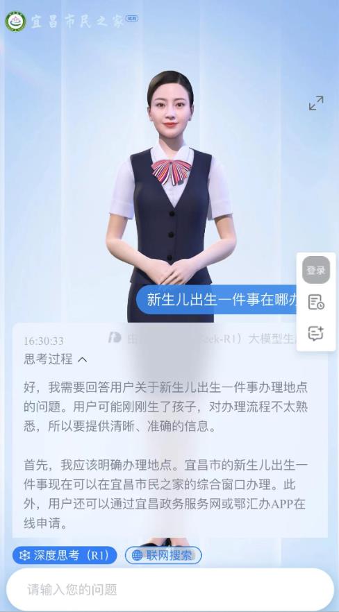 线下服务同样便捷。在宜昌市民之家一楼政务服务大厅,“宜小灵”化身“数字人客服”,通过语音交互、屏幕指引与市民“面对面”沟通。市民在咨询如医保报销等事务时,“宜小灵”会同步显示办理窗口位置,极大地减少了市民的排队等待时间,让政务服务更加贴心、高效。